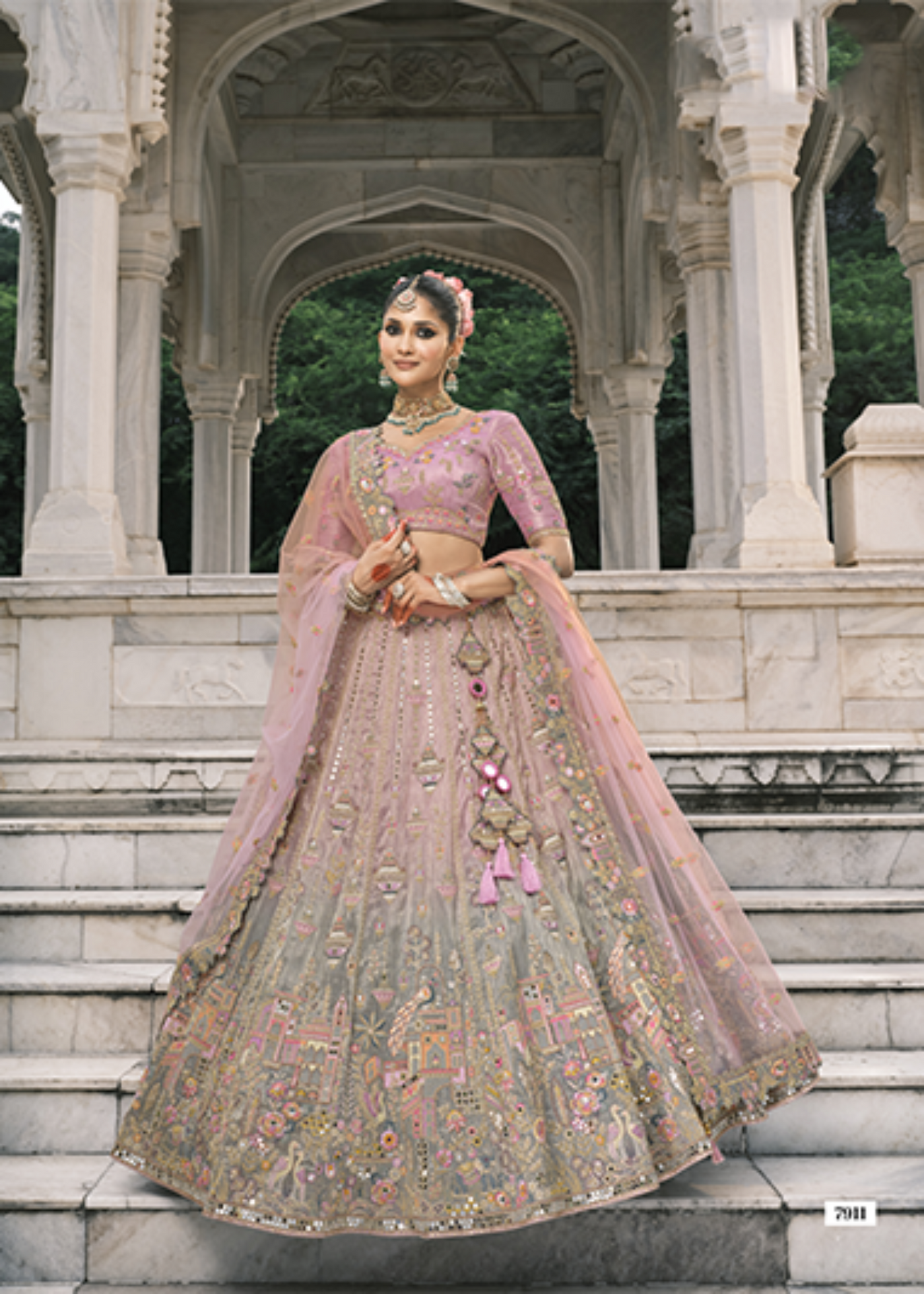 Baby Pink Embroidered Silk Bridal Lehenga – made for the bride who wishes to turn her special day into a story of elegance and charm, this enchanting masterpiece reflects pure sophistication. Crafted from premium silk fabric and paired with a delicate net dupatta, this lehenga radiates soft romantic allure and timeless grace. The gentle baby pink hue symbolizes love and serenity, while the intricate embroidery and shimmering mirror work add a touch of bridal opulence. Perfect for brides who desire a dreamy, ethereal look that blends modern charm with traditional artistry.