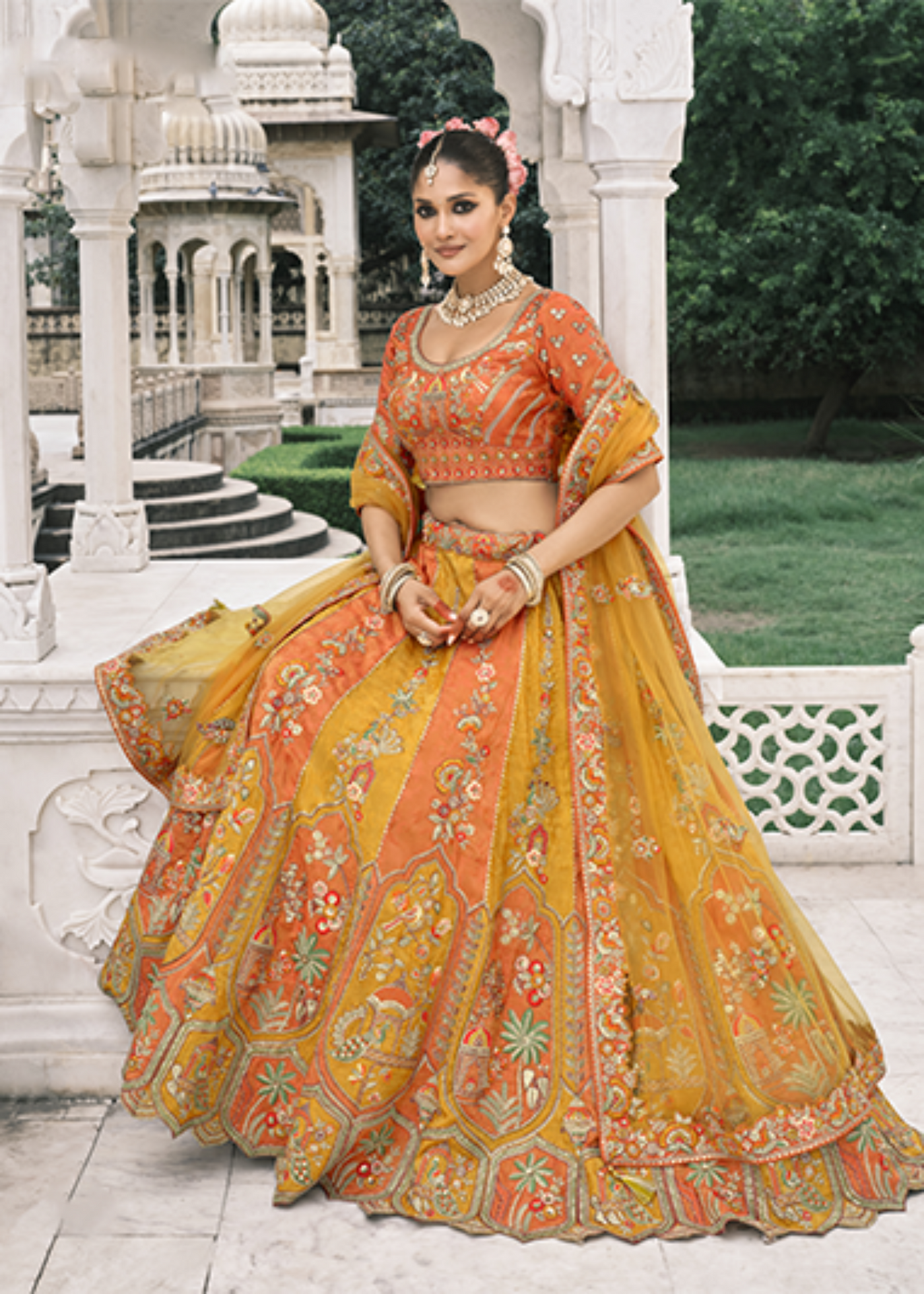 Orange Embroidered Silk Bridal Lehenga – designed for the bride who wishes to embody radiance and regal allure, this magnificent creation captures the essence of celebration and grace. The vibrant orange hue symbolizes joy and confidence, while intricate embroidery and exquisite mirror work enhance its dazzling appeal. Crafted from premium silk, this lehenga showcases masterful artistry and timeless elegance, making it an ideal choice for the bride who wants to shine with grandeur and poise.