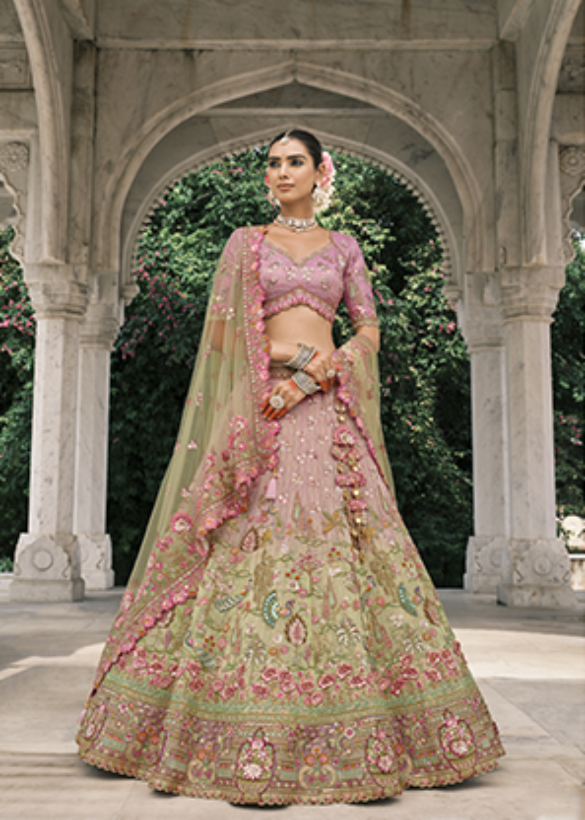Pink-Olive Embroidered Silk Bridal Lehenga – designed for the bride who desires a perfect harmony of elegance and grandeur, this exquisite masterpiece radiates timeless beauty. The soft pink hue blends seamlessly with the sophisticated olive accents, symbolizing romance and poise in every fold. Crafted from premium silk and adorned with intricate embroidery and delicate mirror work, this lehenga captures the essence of regal craftsmanship, making it an unforgettable choice for the modern bride seeking refinement with a touch of tradition.