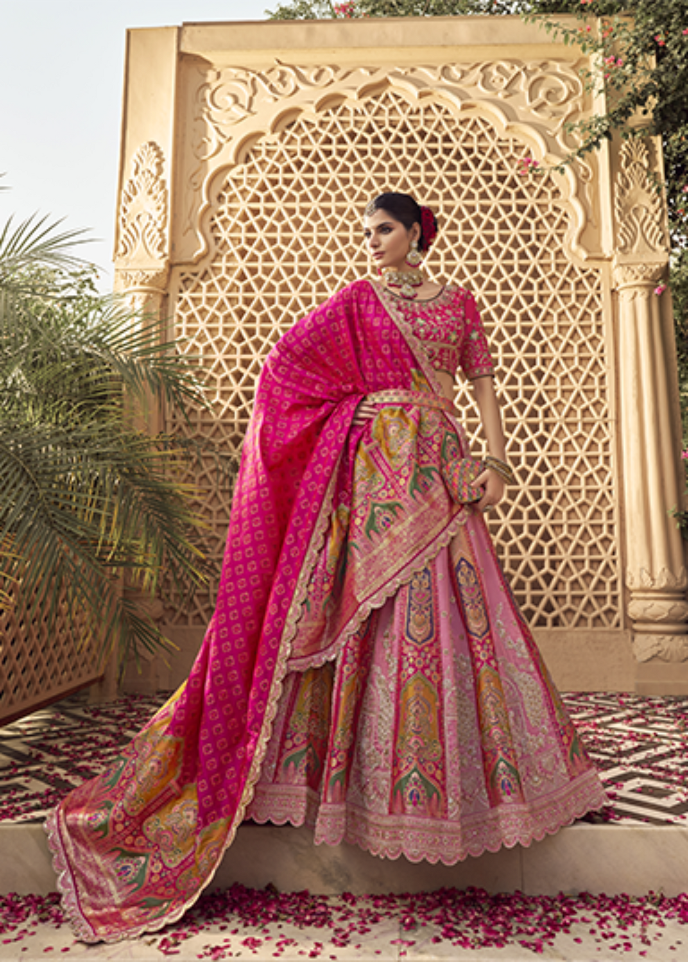 Soft Pink Elegant Zarkan Banarasi Silk Lehenga – a breathtaking creation that celebrates the beauty of tradition wrapped in modern allure. Crafted for the bride who embodies timeless elegance and sophistication, this enchanting ensemble captures the essence of distinguished artistry. The gentle soft pink hue evokes grace and romance, while the intricate elegant zarkan and cutwork detailing on luxurious Banarasi silk adds an opulent charm. Every stitch reflects heritage craftsmanship, making it a captivating choice for brides who seek a distinguished yet graceful aura on their special day.