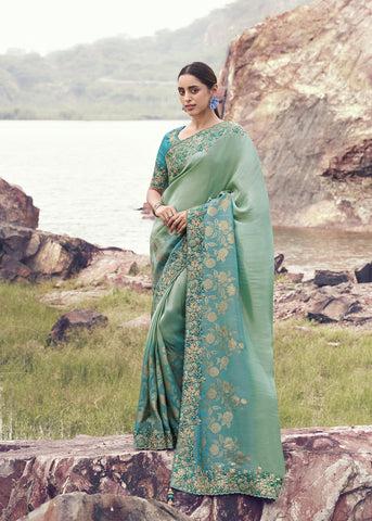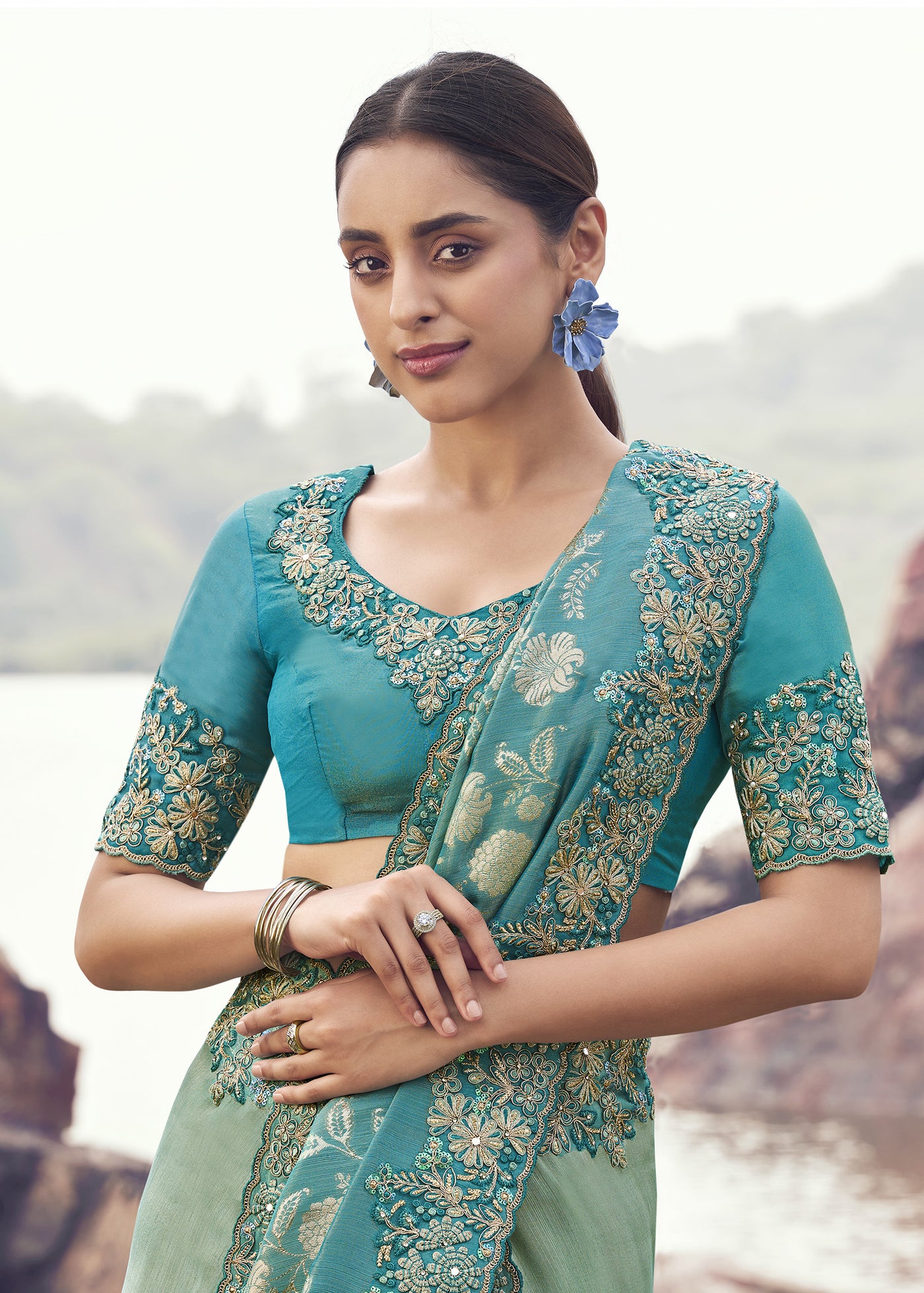 Aqua Green Jacquard Silk wedding Saree – a chic, refined drape crafted for women who appreciate understated luxury with a striking twist. The cool cyan shade pairs beautifully with the rich jacquard silk weave, giving the saree a structured yet graceful fall. The woven patterns add depth and dimension, making the look effortlessly elegant without needing heavy embellishment.