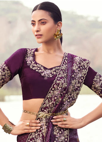 Deep Purple Jacquard Silk wedding Saree – a rich, striking drape crafted for women who want a powerful yet graceful festive look. The deep purple tone adds depth and luxury, while the jacquard silk fabric gives a naturally regal sheen and structured fall. The woven detailing brings in subtle artistry, making it perfect for anyone who prefers understated elegance with a high-fashion edge.