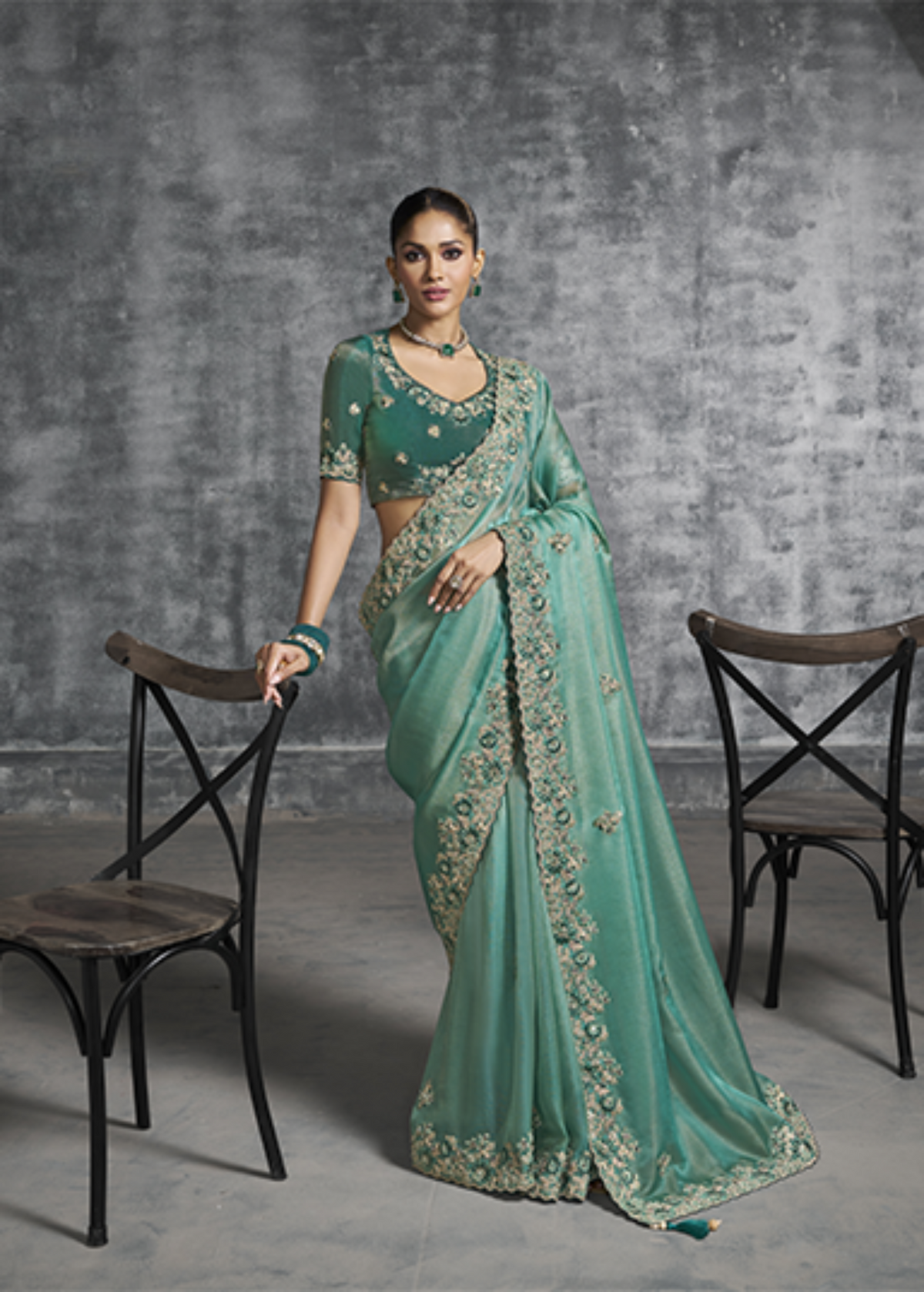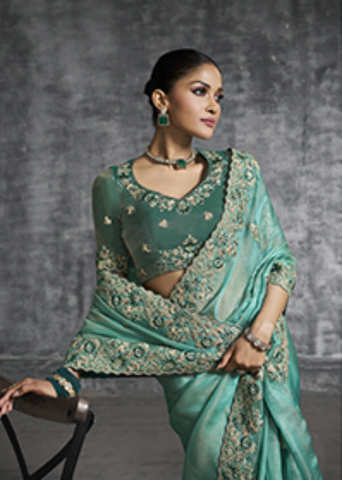 Green Tissue Zari Embroidered Saree Sale
