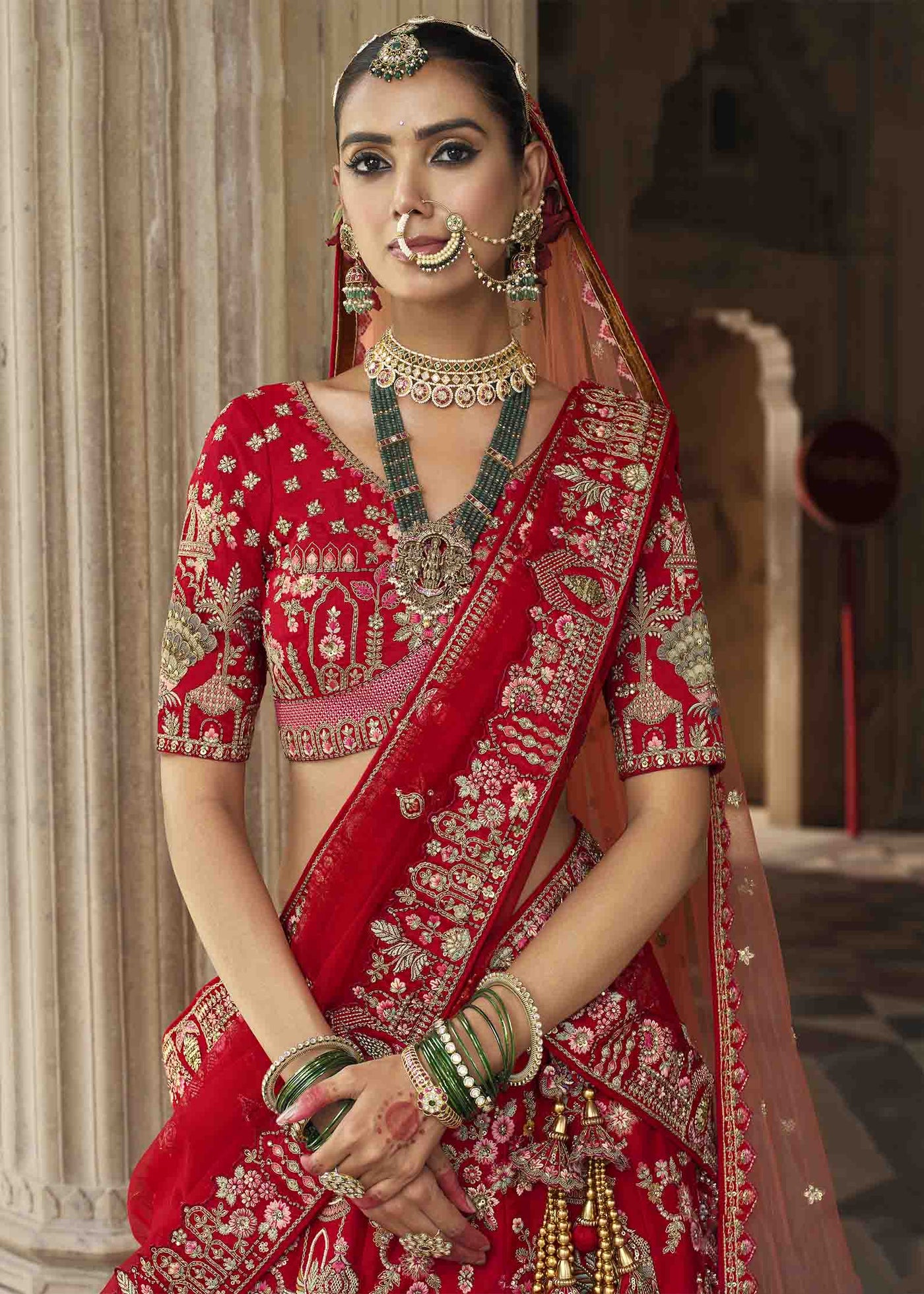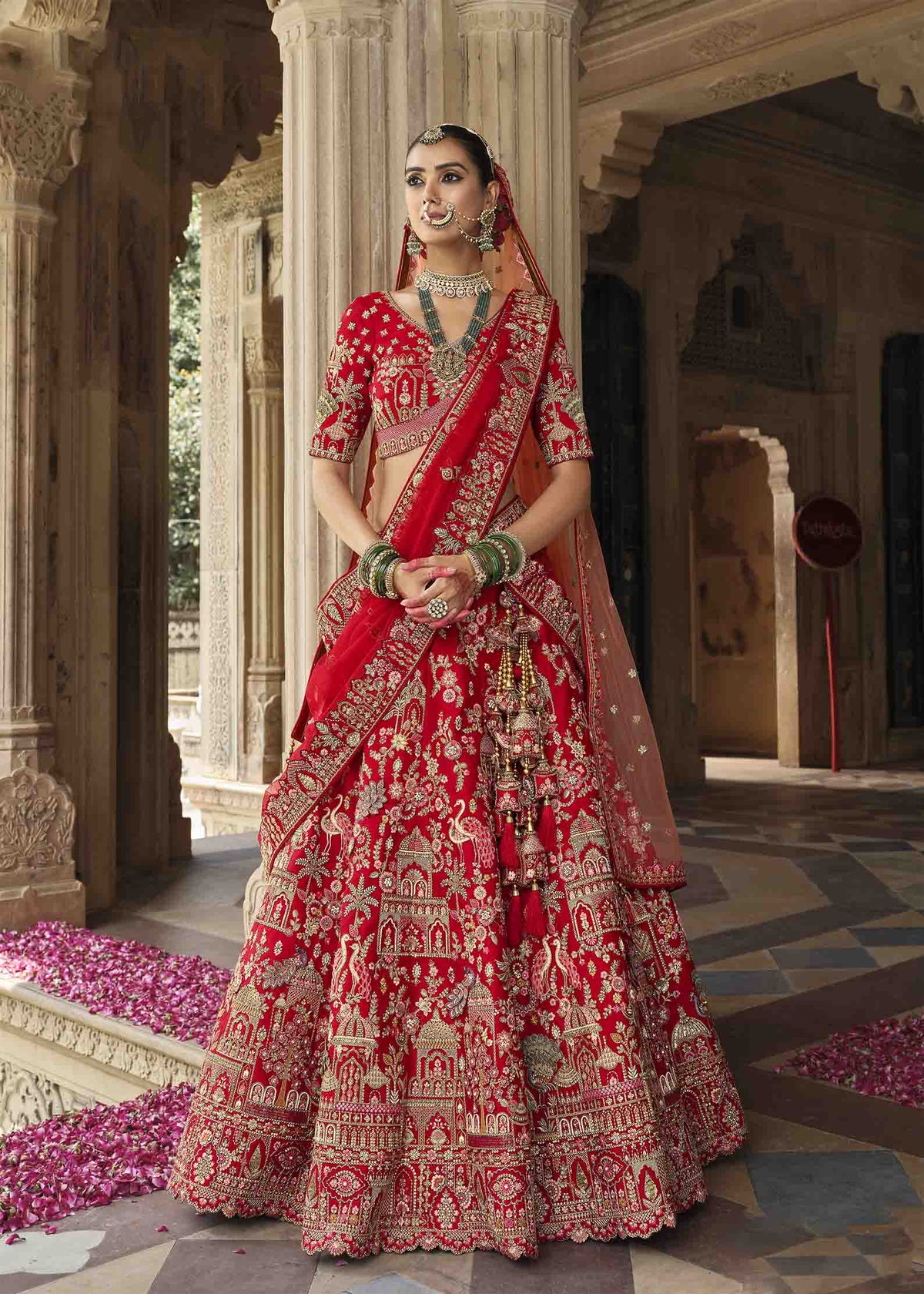 Red Royal Embroidered Bridal Silk Lehenga – an exquisite masterpiece that embodies timeless bridal beauty infused with royal sophistication. Designed for the bride who dreams of a timeless and majestic look, this ensemble exudes luxury and grace in every detail. The rich red hue symbolizes love and strength, while intricate khatli embroidery and heavy handwork elevate its royal charm. Crafted from premium bridal silk, it’s paired with a beautifully worked silk blouse and a delicate net dupatta that completes the ensemble with sheer finesse.