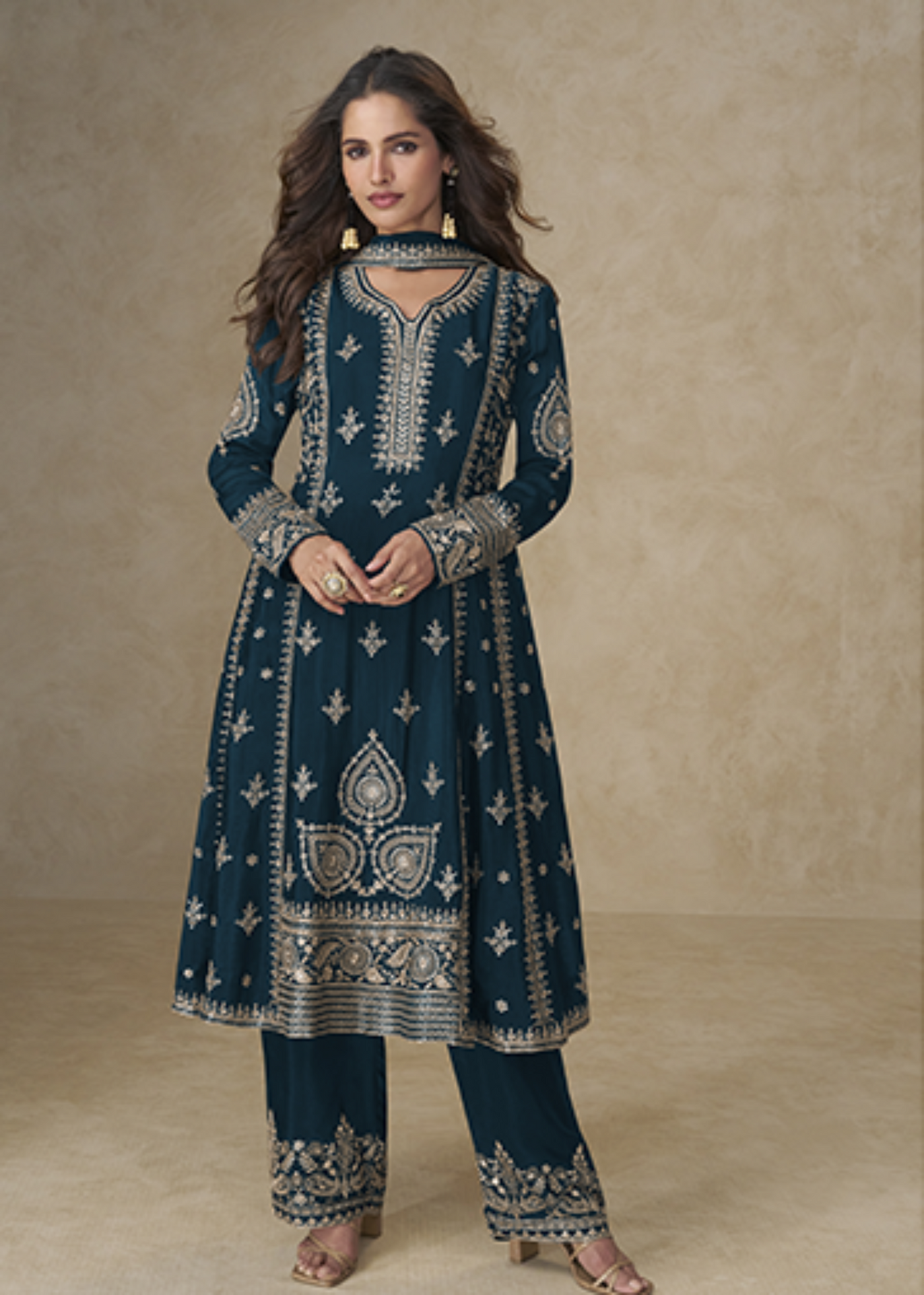 Teal Blue Zari Embroidered Chinon Silk Suit- Experience unmatched elegance with this captivating Royal Heritage Collection. Crafted from rich georgette fabric, this ensemble features intricate golden zari and sequin embroidery throughout, creating a mesmerizing balance of tradition and sophistication. The front-open kameez design is detailed with ornate motifs, adding grandeur to its luxurious appeal. The matching embroidered bottom showcases elaborate patterns at the hem, enhancing the regal silhouette. Paired with a beautifully coordinated dupatta featuring embroidered borders and motifs.