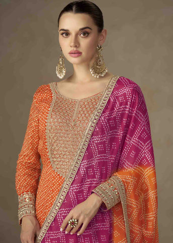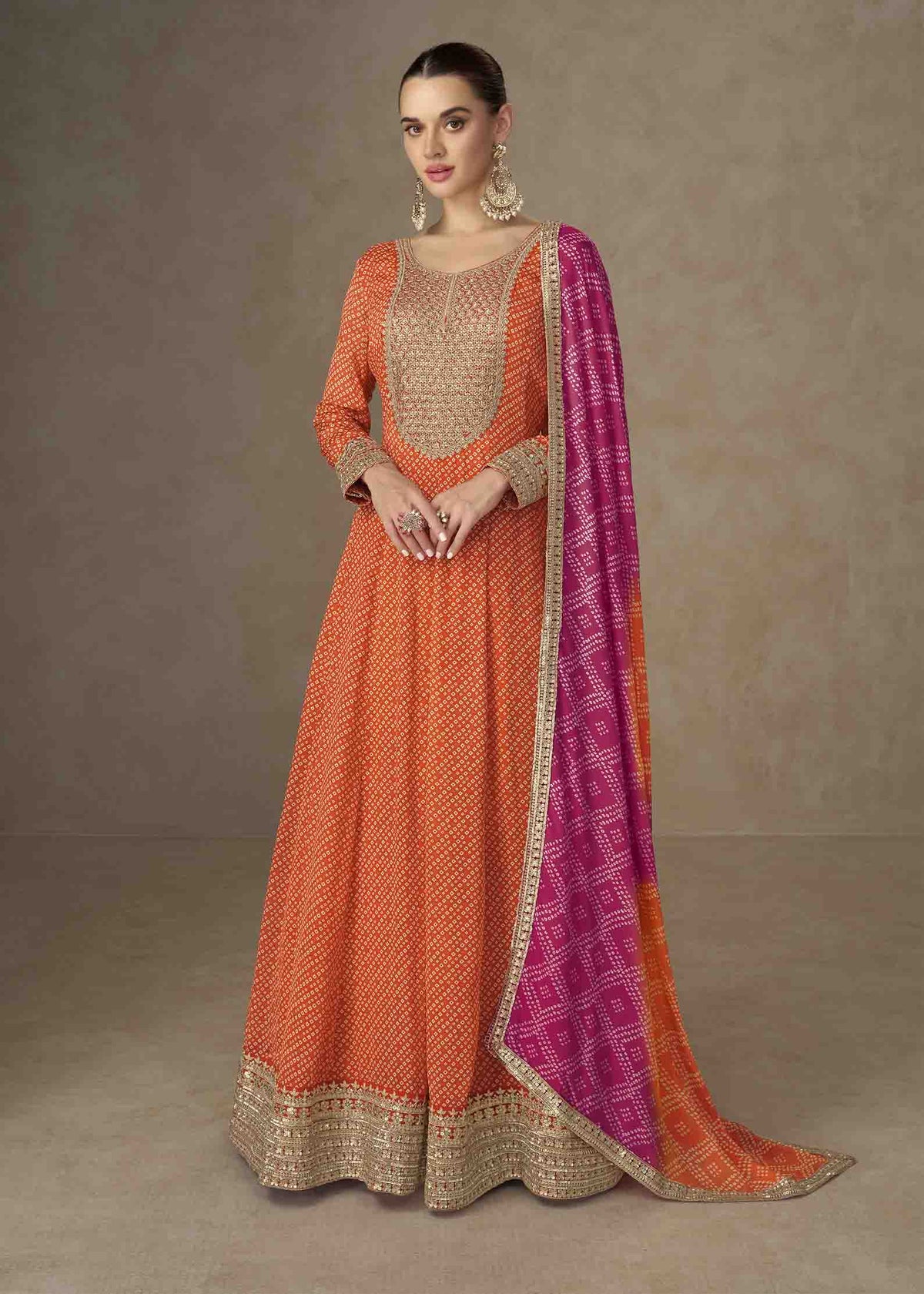 Orange Radiant Chinon Digital Print Gown – a vibrant creation that captures the spirit of celebration and timeless elegance. The lively orange hue symbolizes joy and confidence, while the luxurious chinon fabric flows gracefully with a luminous sheen. Decorated with exquisite digital prints and fine craftsmanship, this gown blends festive charm with modern sophistication, making it a perfect choice for special occasions and joyful gatherings.