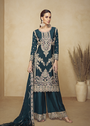 Dark Green Silk Hand Embroidered Palazzo Suit Sale
