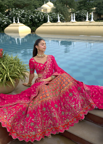 Dark Pink Embroidered Designer Bridal Lehenga – a soft yet striking ensemble designed for women who want to look effortlessly elevated without drowning in heavy, outdated designs. The warm pink tone works perfectly with the natural sheen of silk, giving the outfit a refined fall and a polished finish. The net dupatta adds a light, graceful layer, while the detailed work across the lehenga pulls the whole look together into something genuinely festive and visually sharp.