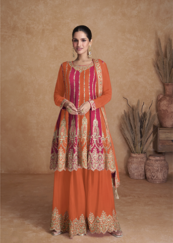 Orange Elegant Chinon Embroidered Sharara Suit – made for the woman who celebrates grace with every step, this enchanting ensemble is a true reflection of festive opulence and refined style. The vibrant orange hue embodies joy and grandeur, while the intricate embroidery lends a touch of regal artistry. Tailored from luxurious Elegant Chinon fabric, the outfit drapes beautifully with a soft, luminous sheen that enhances its royal appeal. Perfect for weddings, festivities, and traditional gatherings, it exudes a timeless elegance that never fades.