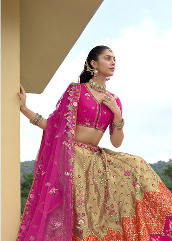 Pink Embroidered Designer Bridal Lehenga – a soft yet striking ensemble designed for women who want to look effortlessly elevated without drowning in heavy, outdated designs. The warm pink tone works perfectly with the natural sheen of silk, giving the outfit a refined fall and a polished finish. The net dupatta adds a light, graceful layer, while the detailed work across the lehenga pulls the whole look together into something genuinely festive and visually sharp.
