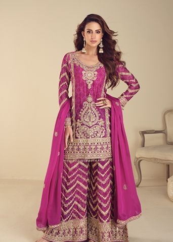 Pink Real Chinon Palazzo Suit – radiate effortless elegance in this thoughtfully designed piece from the Designer Elegance Collection. Crafted from luxurious real Chinon fabric, this ensemble features a beautifully printed top paired with matching digital-print palazzo pants and a graceful dupatta. The soft pink hue blends sophistication with freshness, while the soft, fluid texture of Chinon fabric ensures a comfortable yet opulent drape. The digital print artistry adds a contemporary charm, making this outfit a perfect balance of modern style and traditional grace.