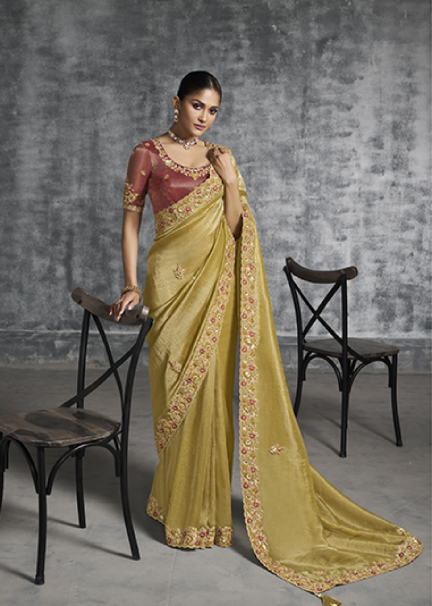 Regal Gold Tissue Zari Embroidered Saree – radiate effortless elegance in this thoughtfully designed masterpiece from the Designer Elegance Collection. Crafted from premium tissue fabric, this saree features intricate zari embroidery that beautifully adorns its borders and pallu with refined floral motifs. The luxurious regal gold hue exudes opulence and festive grandeur, while the soft shimmer of the fabric adds a graceful glow. Paired with a matching embroidered blouse, this ensemble perfectly balances tradition and contemporary sophistication.