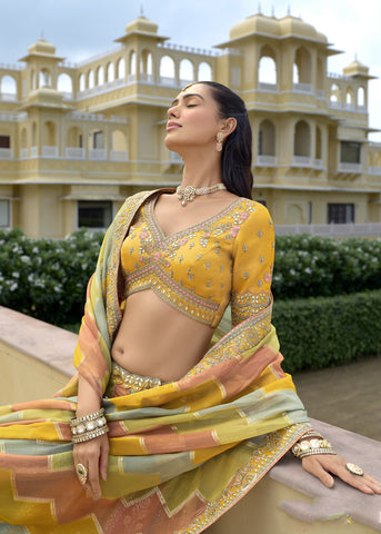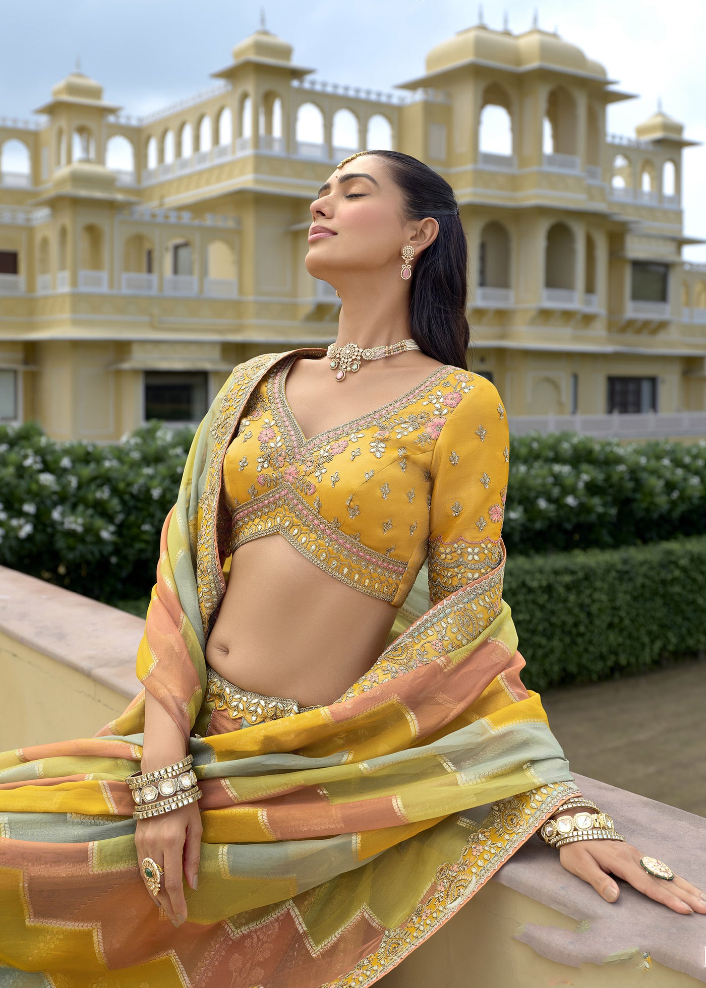 Sage Mustard Embroidered Designer Bridal Lehenga – a rich, vibrant ensemble made for women who love standing out with style and intention. The striking mustard tone pairs beautifully with the smooth sheen of silk, creating a bold yet graceful look. The net dupatta adds a soft, airy contrast, while the detailed work on the lehenga elevates it into a true occasion-ready statement.