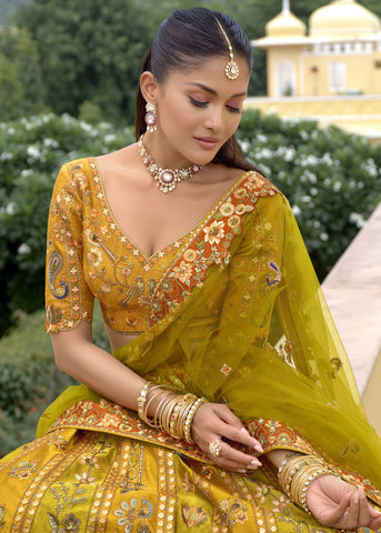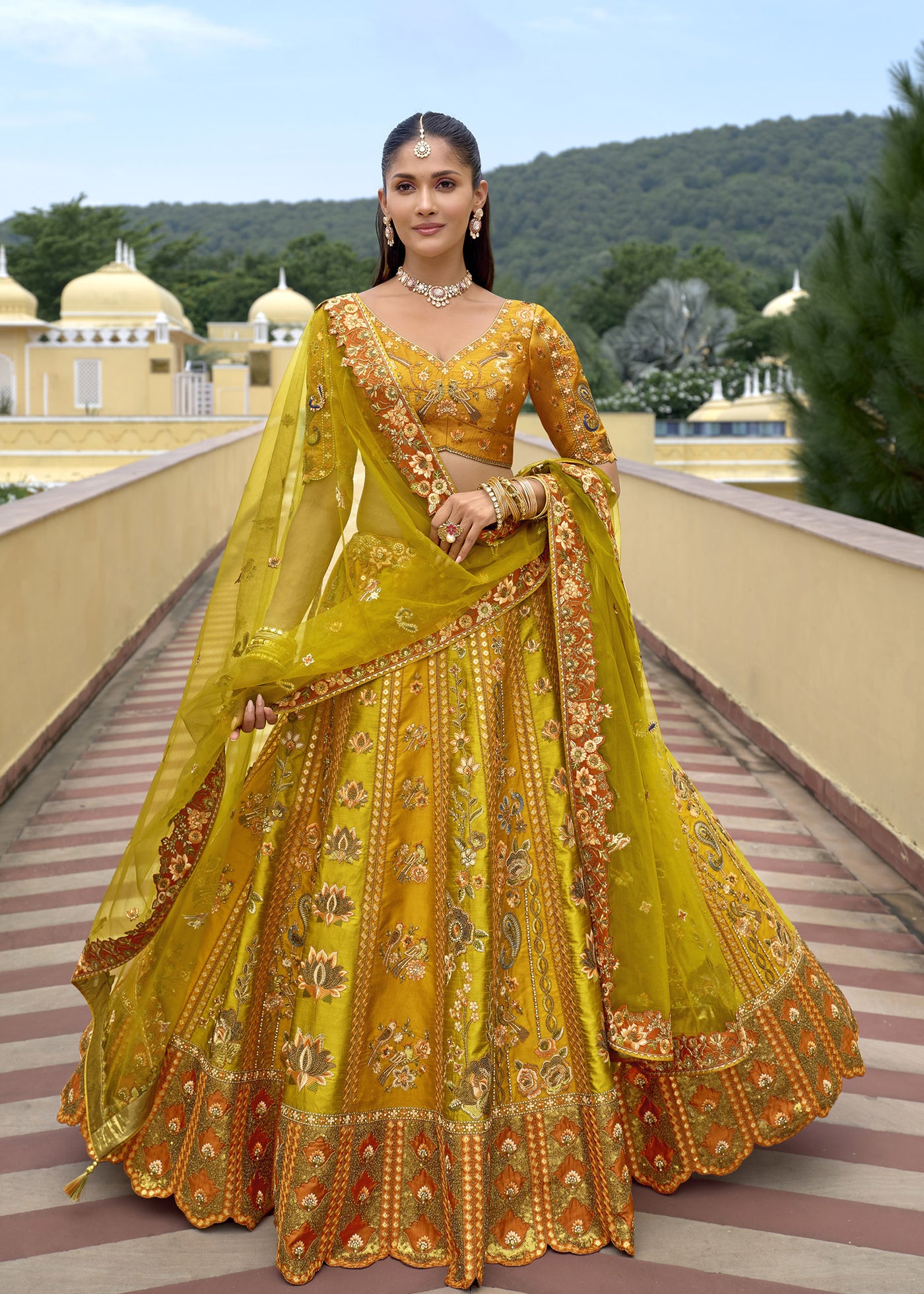 Yellow Gold Embroidered Designer Bridal Lehenga – a striking, regal ensemble crafted for women who want a rich wedding look without going over the top. The yellow-gold tone gives a naturally luminous finish, while the premium silk blouse and lehenga create a structured, graceful silhouette. The net dupatta adds softness and balance, making the whole outfit look polished and effortlessly festive. Intricate embroidery enhances the design with refined detailing, giving it the right amount of celebration-worthy sparkle.