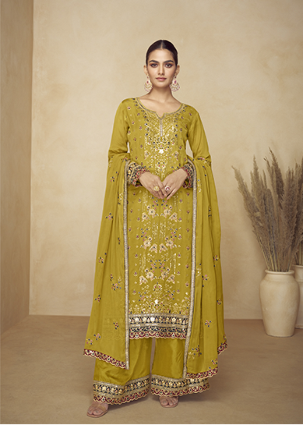 Yellow Silk Hand Embroidered Palazzo Suit – embrace graceful sophistication with this exquisitely crafted ensemble from the Designer Elegance Collection. Made from luxurious silk, this outfit features a fully hand-embroidered top, matching silk palazzo pants, and a graceful dupatta. Enhanced with intricate zari work, the delicate embroidery adds a regal, artisanal charm. The bright yellow hue radiates warmth and elegance, while the smooth silk fabric ensures a comfortable yet opulent drape, making this outfit a perfect blend of traditional craftsmanship and modern style.