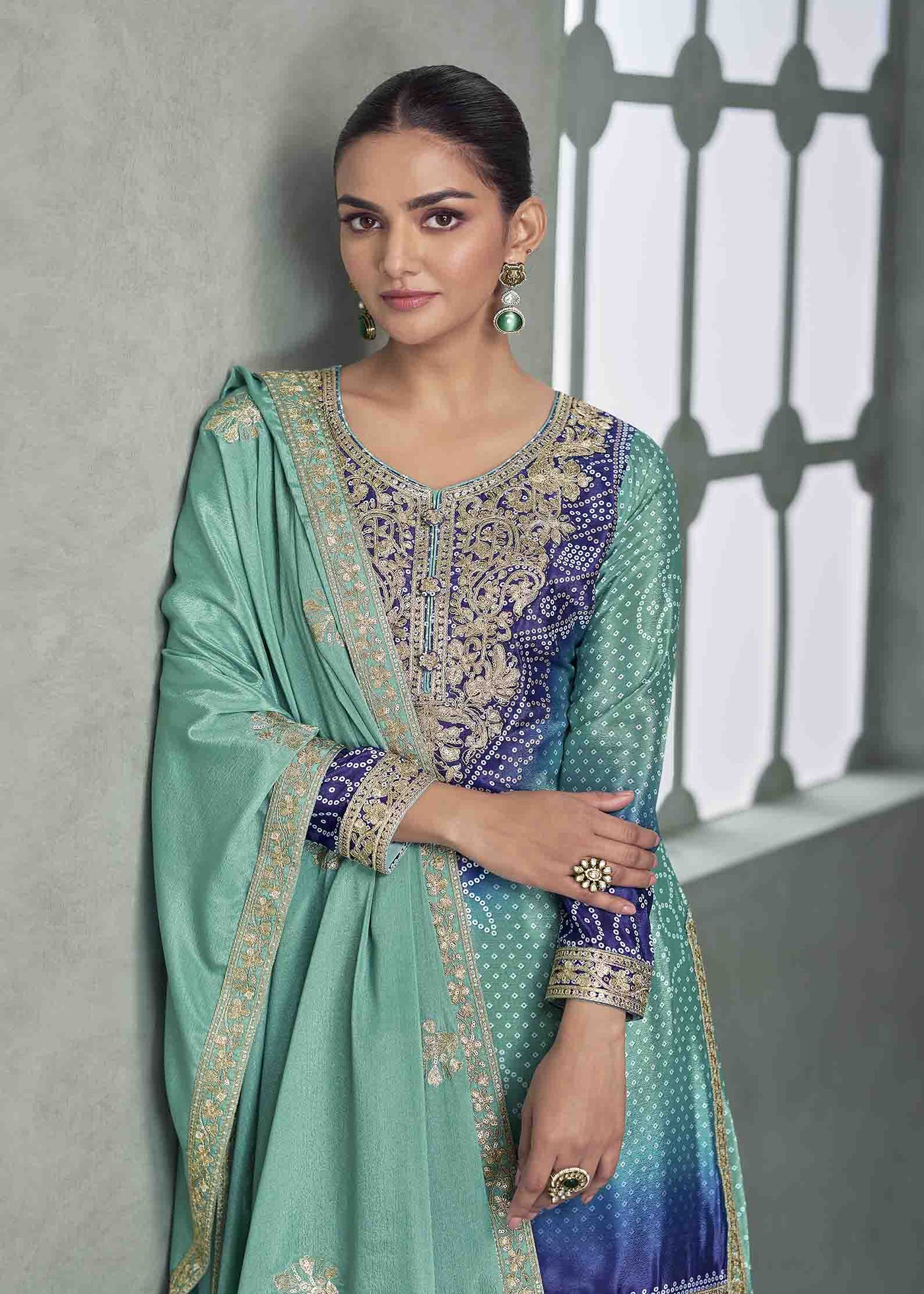 Cyan Elegant Chinnon Silk Plazzo Suit Sale