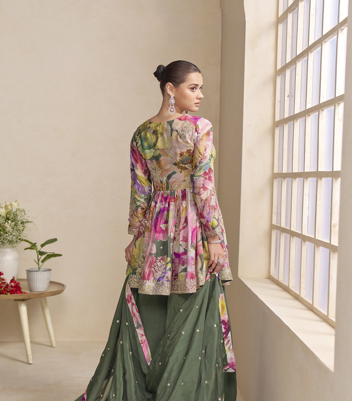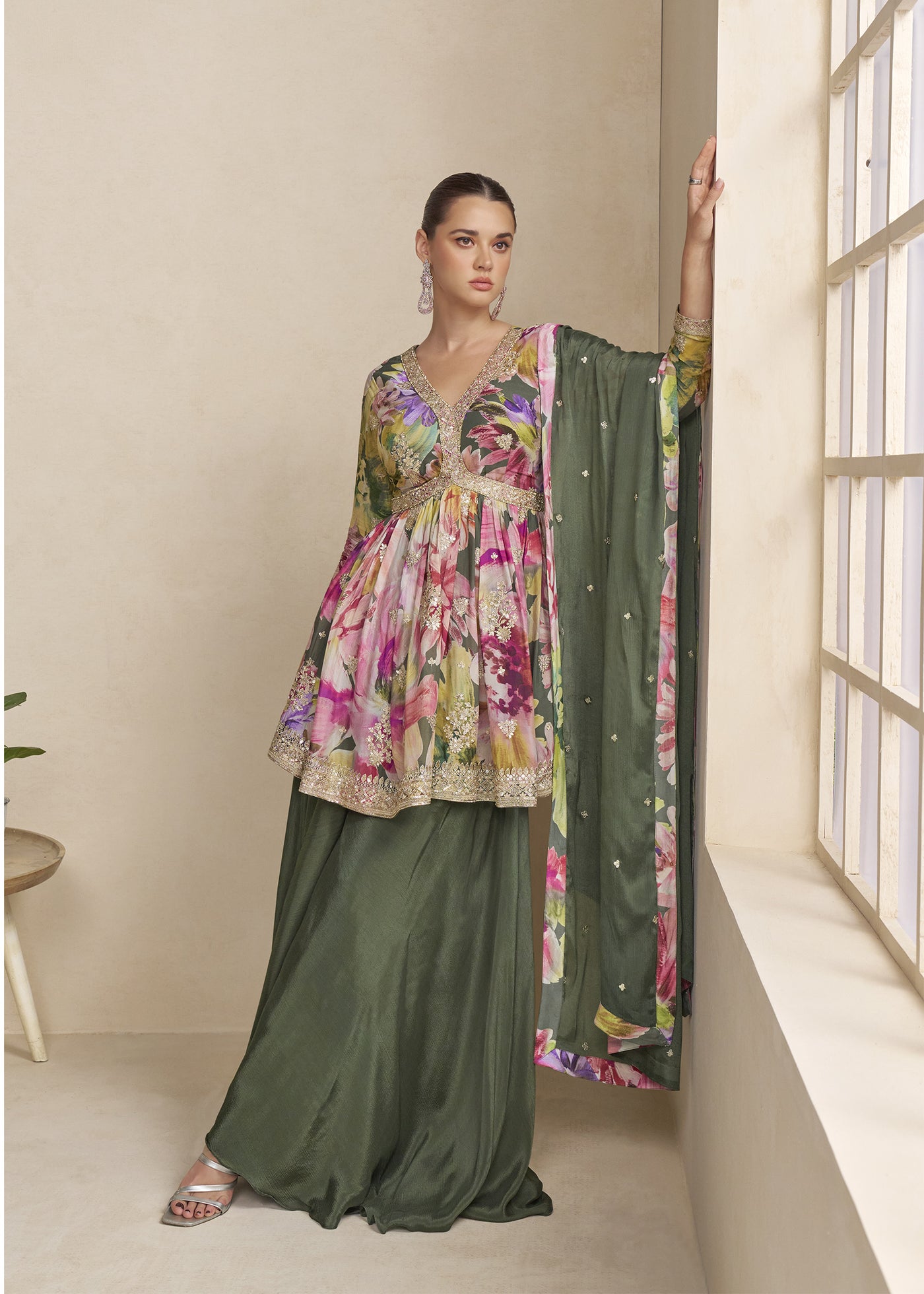 Green Chinon Silk Palazzo Suit Sale