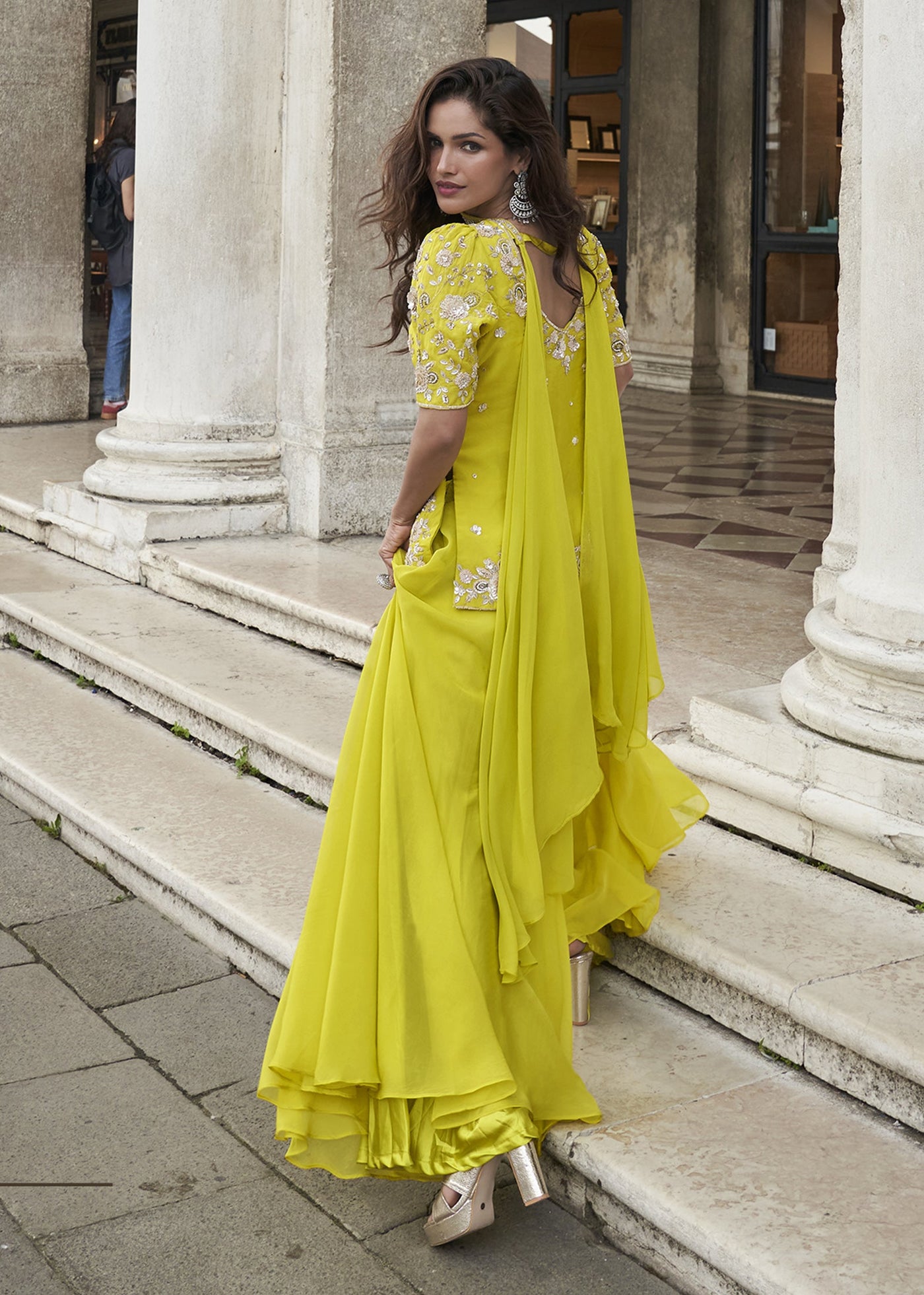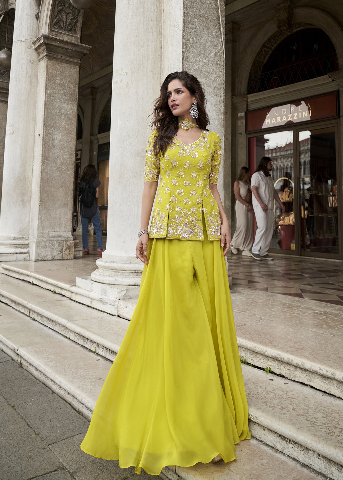 Yellow Organza Silk Embroidered Palazzo Suit – a radiant, uplifting, and exquisitely crafted ensemble designed for women who love vibrant elegance with a refined touch. The cheerful yellow shade pairs beautifully with the lightweight richness of premium real organza silk, giving the outfit an ethereal flow and festive brilliance. The front and back embroidered top, coordinated palazzo, and intricately embroidered dupatta create a graceful look perfect for haldi ceremonies, festive events, and daytime celebrations.
