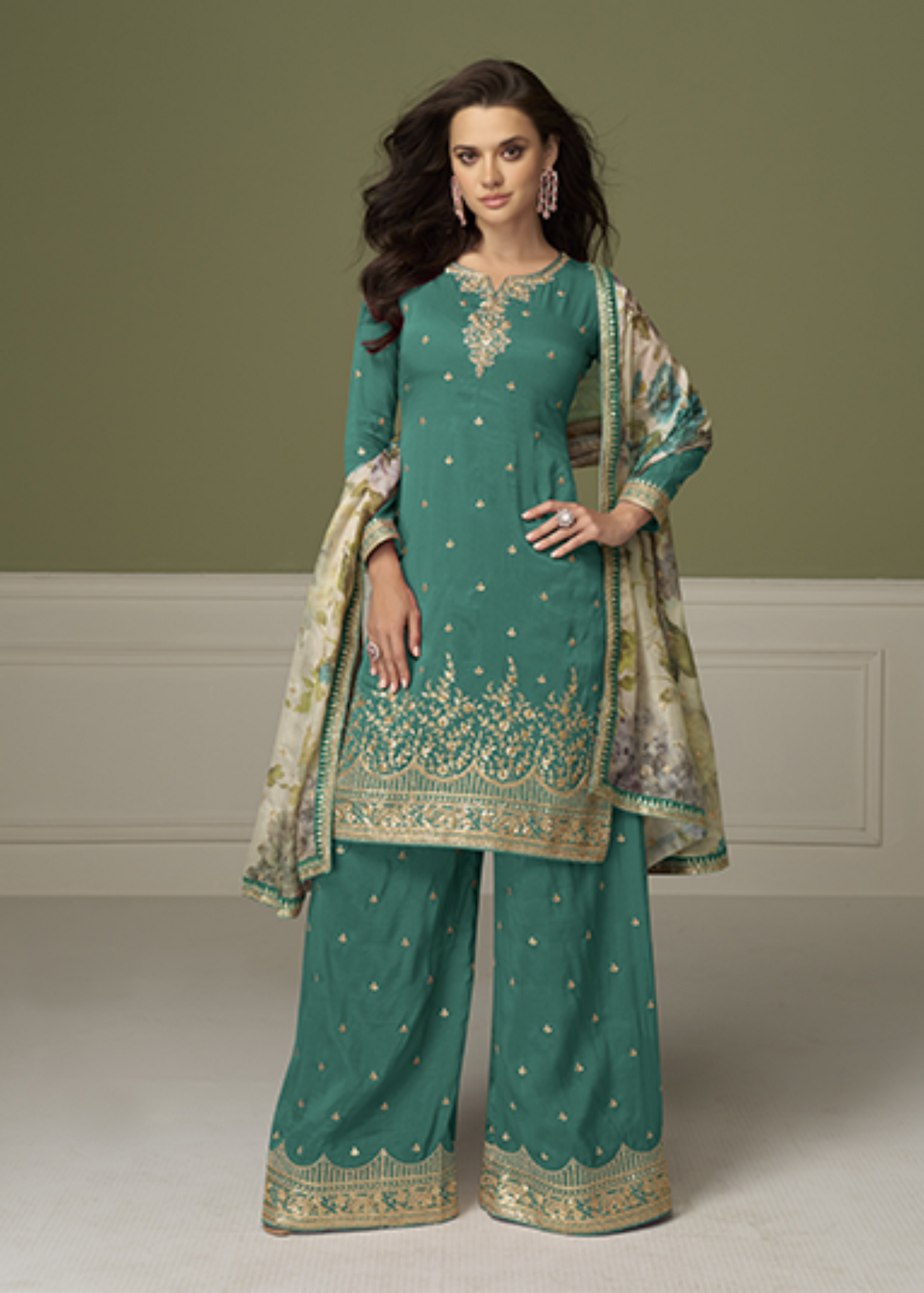 Green Simar Silk Embroidered Palazzo Suit Sale