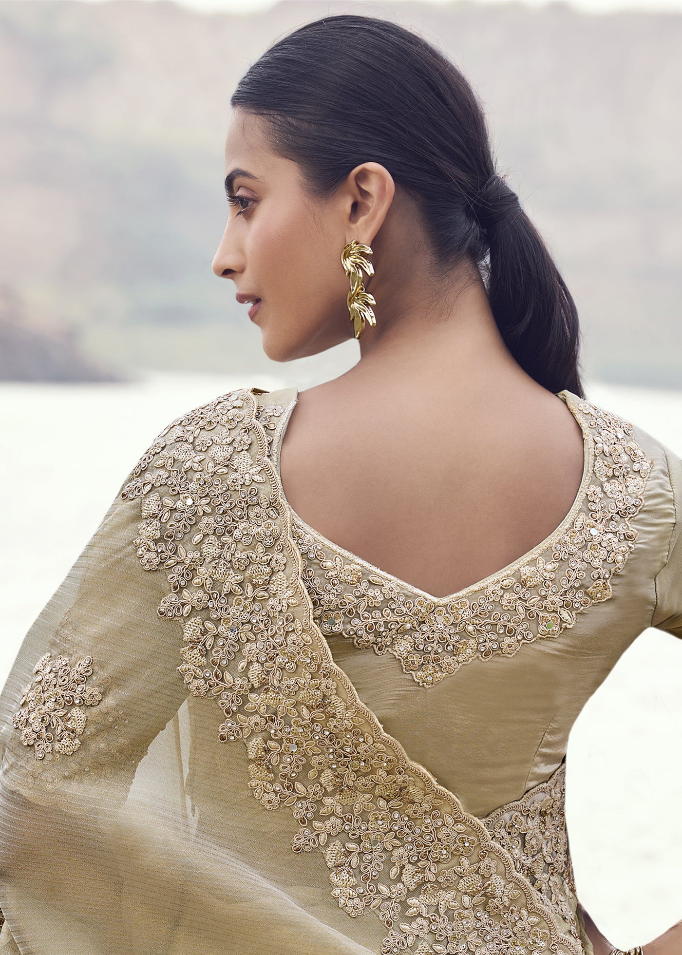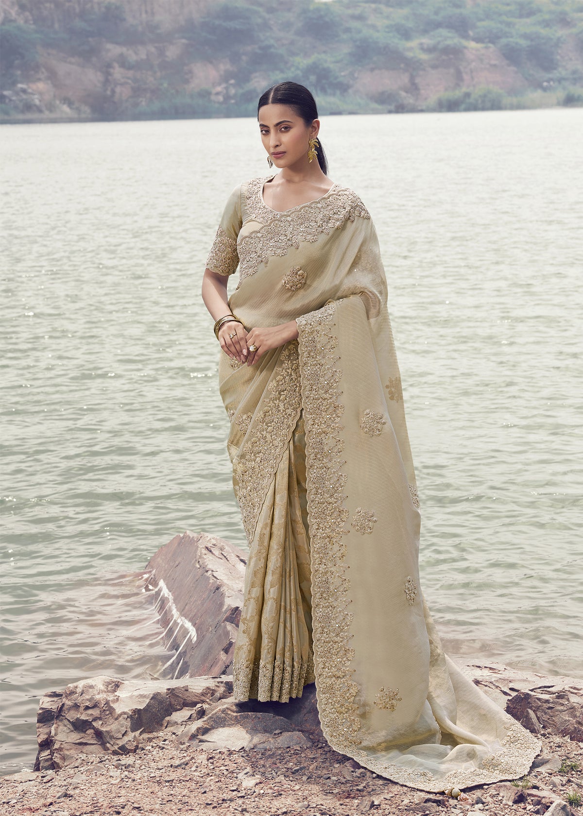 Beige Jacquard Silk Saree – a clean, tasteful, and effortlessly classy drape made for women who prefer understated luxury over loud styling. The soft beige tone enhances the rich jacquard weave, giving the saree a naturally premium sheen without being flashy. The intricate woven patterns add depth and elegance, making it the kind of outfit that speaks refinement through subtle details rather than over-the-top embellishment.