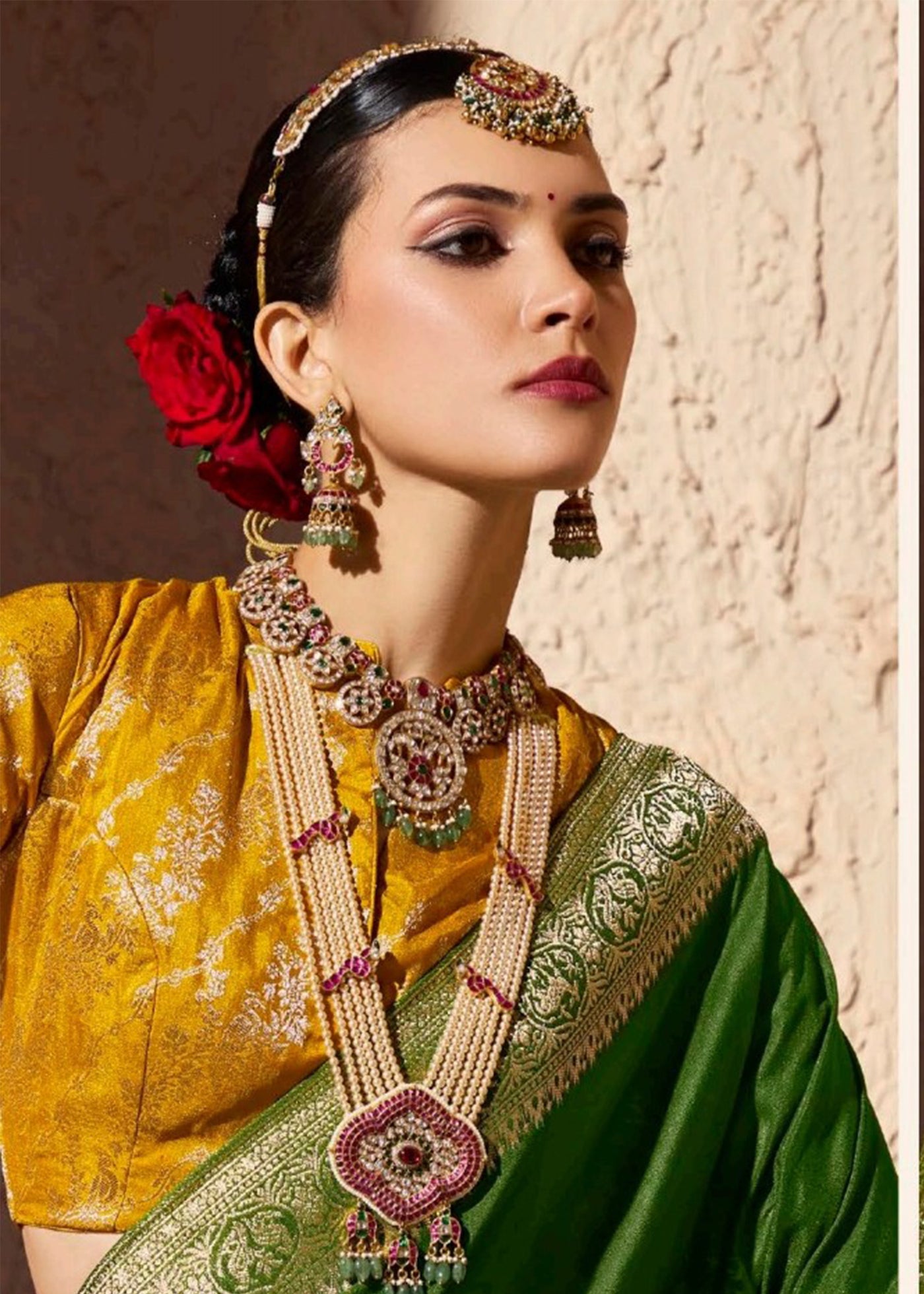 Green Crape Georgette Zari Saree – an elegant, radiant, and richly crafted saree designed for women who appreciate timeless Indian aesthetics with a modern edge. The soothing green hue beautifully complements the fluid texture of crape georgette, creating a graceful and flattering drape. Accented with exquisite zari weaving throughout, the saree embodies festive sophistication and effortless charm.