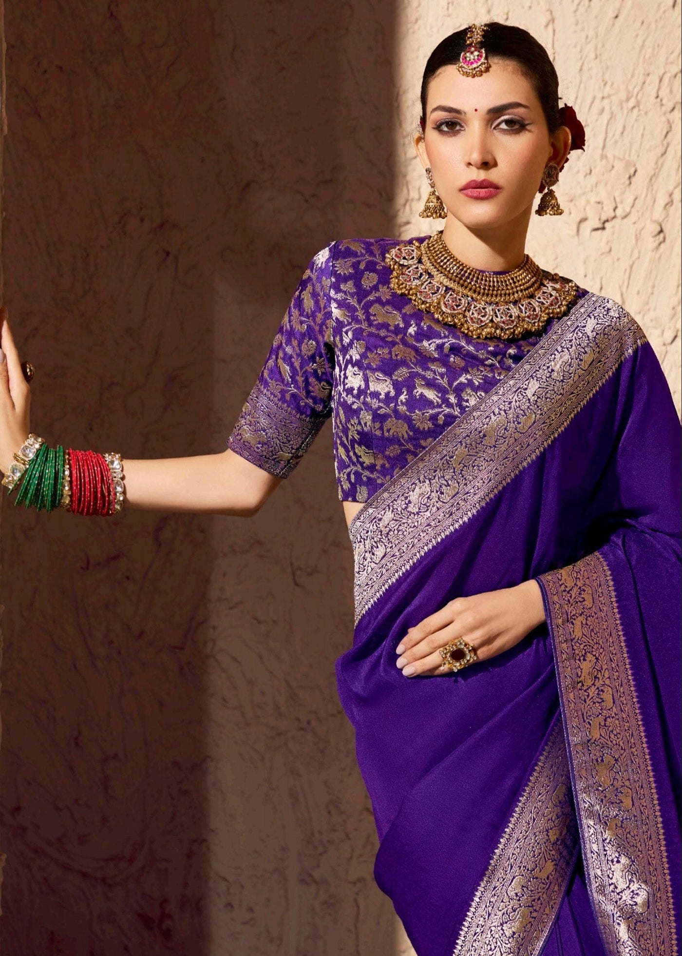 Violet Crape Georgette Zari Saree – a royal, sophisticated, and radiant drape crafted for women who appreciate rich tones with timeless craftsmanship. The deep violet shade blends seamlessly with the fluid fall of crape georgette, offering a graceful silhouette that exudes poise and charm. Adorned with elegant zari weaving throughout, this saree combines tradition and luxury, making it a perfect choice for festive occasions and grand celebrations.