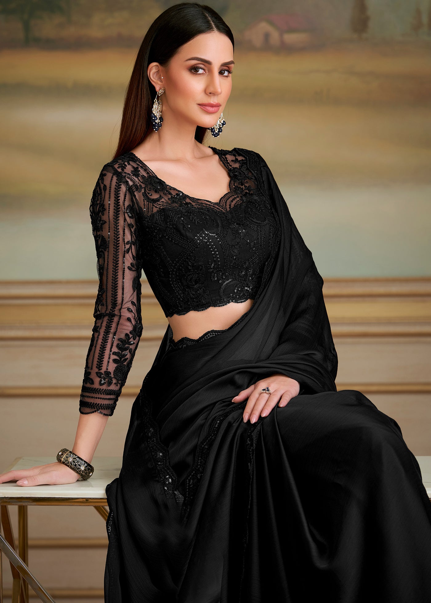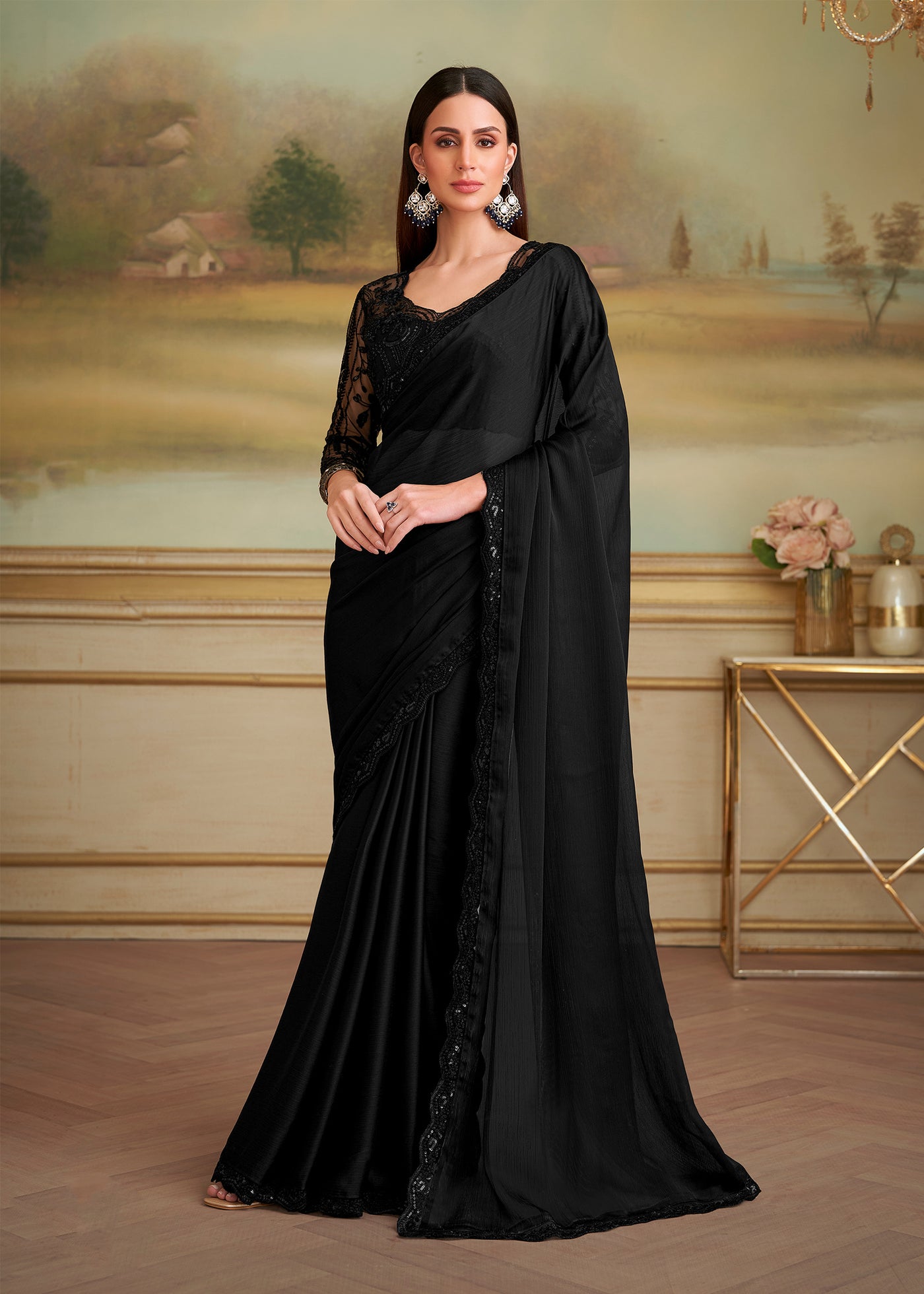 Black Shining Georgette Silk Designer Saree Sale