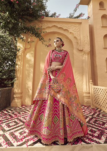 Candy Pink Majestic Zarkan Banarasi Silk Lehenga – a breathtaking creation that celebrates the beauty of tradition wrapped in modern allure. The soft candy-pink hue exudes romance and sophistication, while intricate Zarkan and Cutwork detailing adds a mesmerizing shimmer. Crafted from premium Banarasi silk, this masterpiece showcases the richness of traditional weaving blended seamlessly with contemporary bridal finesse. Every fold and motif reflects fine artistry, making it an unforgettable choice for the bride who wishes to shine with elegance and poise.