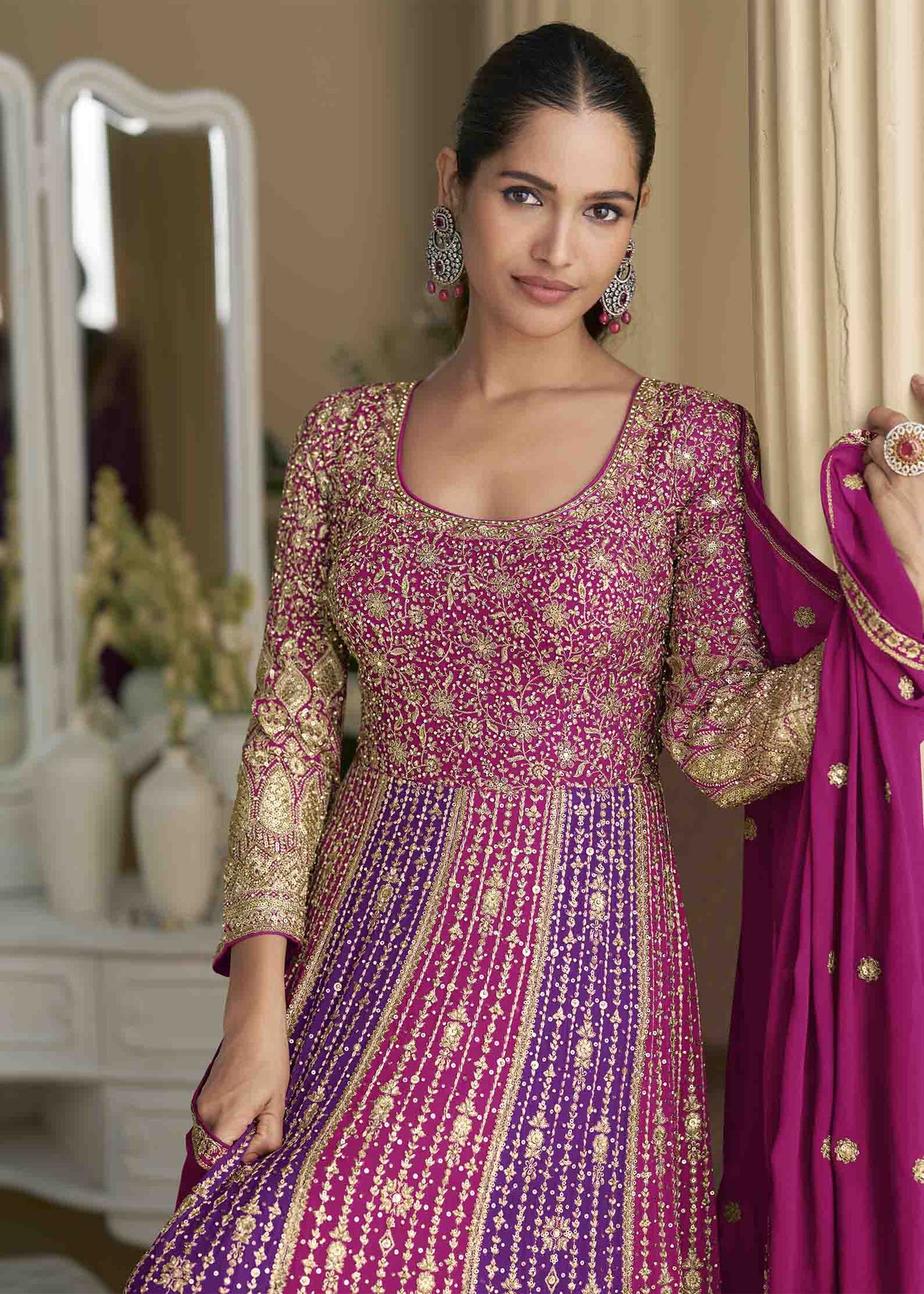 Dark Pink Exclusive Georgette Embroidered Gown - a breathtaking creation that celebrates the beauty of elegance wrapped in royal charm. Crafted for the woman who loves to make a graceful statement, this masterpiece blends contemporary allure with traditional craftsmanship. The vibrant dark pink hue radiates femininity and confidence, while intricate seroski and zarkan embroidery add a touch of luxurious sparkle. Made from exclusive georgette, it drapes effortlessly, creating a regal and refined festive look.