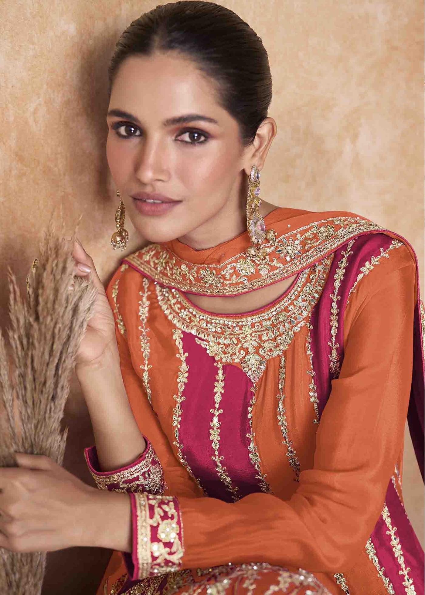 Orange Elegant Chinon Embroidered Sharara Suit – made for the woman who celebrates grace with every step, this enchanting ensemble is a true reflection of festive opulence and refined style. The vibrant orange hue embodies joy and grandeur, while the intricate embroidery lends a touch of regal artistry. Tailored from luxurious Elegant Chinon fabric, the outfit drapes beautifully with a soft, luminous sheen that enhances its royal appeal. Perfect for weddings, festivities, and traditional gatherings, it exudes a timeless elegance that never fades.