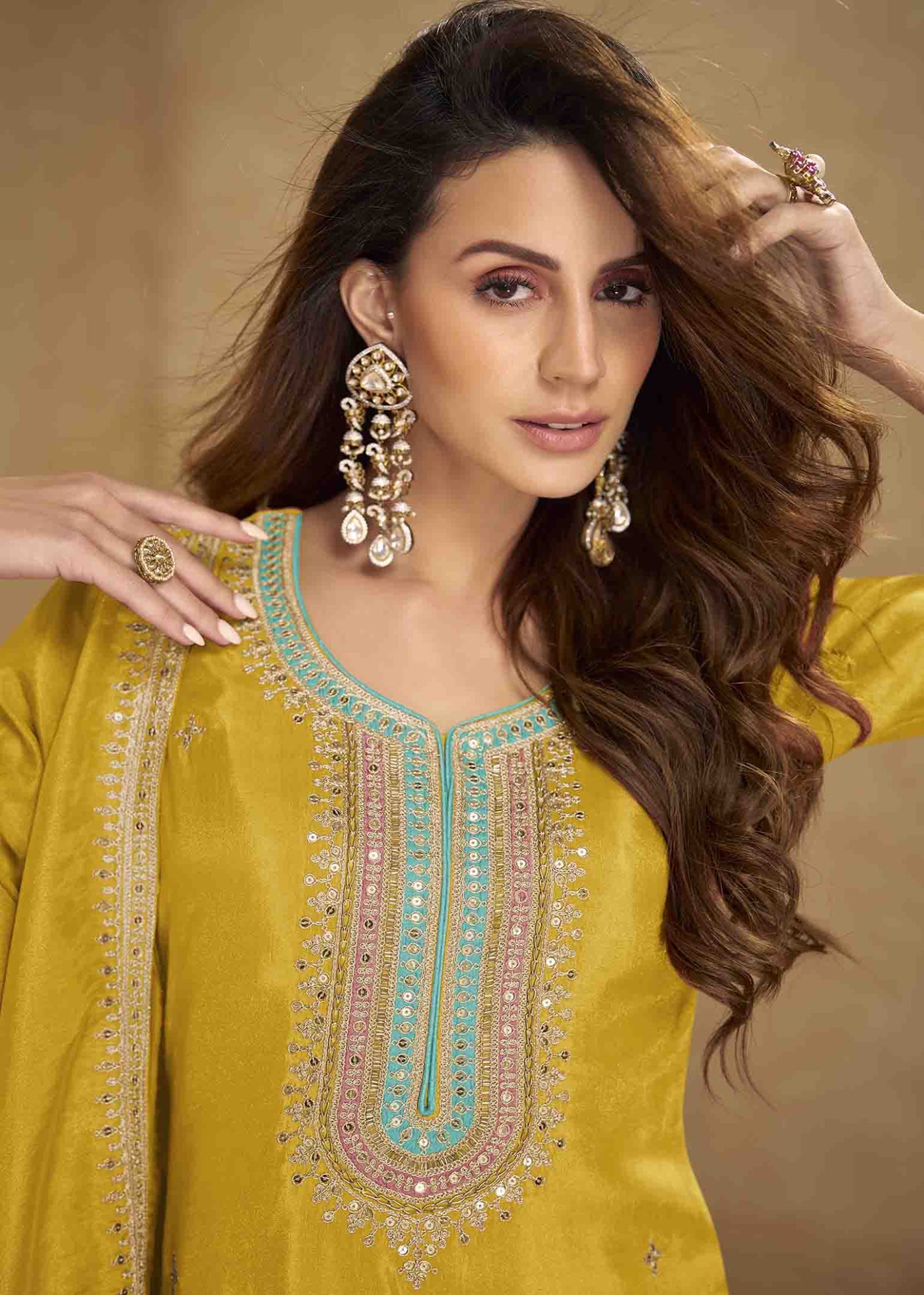 Yellow Simar Silk Salwar Suit – a radiant creation that captures the spirit of celebration and timeless beauty. The bright yellow hue symbolizes joy and positivity, while the luxurious Simar silk fabric drapes gracefully with a soft sheen. Designed with elegant embroidery and refined detailing, this salwar suit perfectly balances tradition and modern sophistication, making it a stunning choice for festive and special occasions.