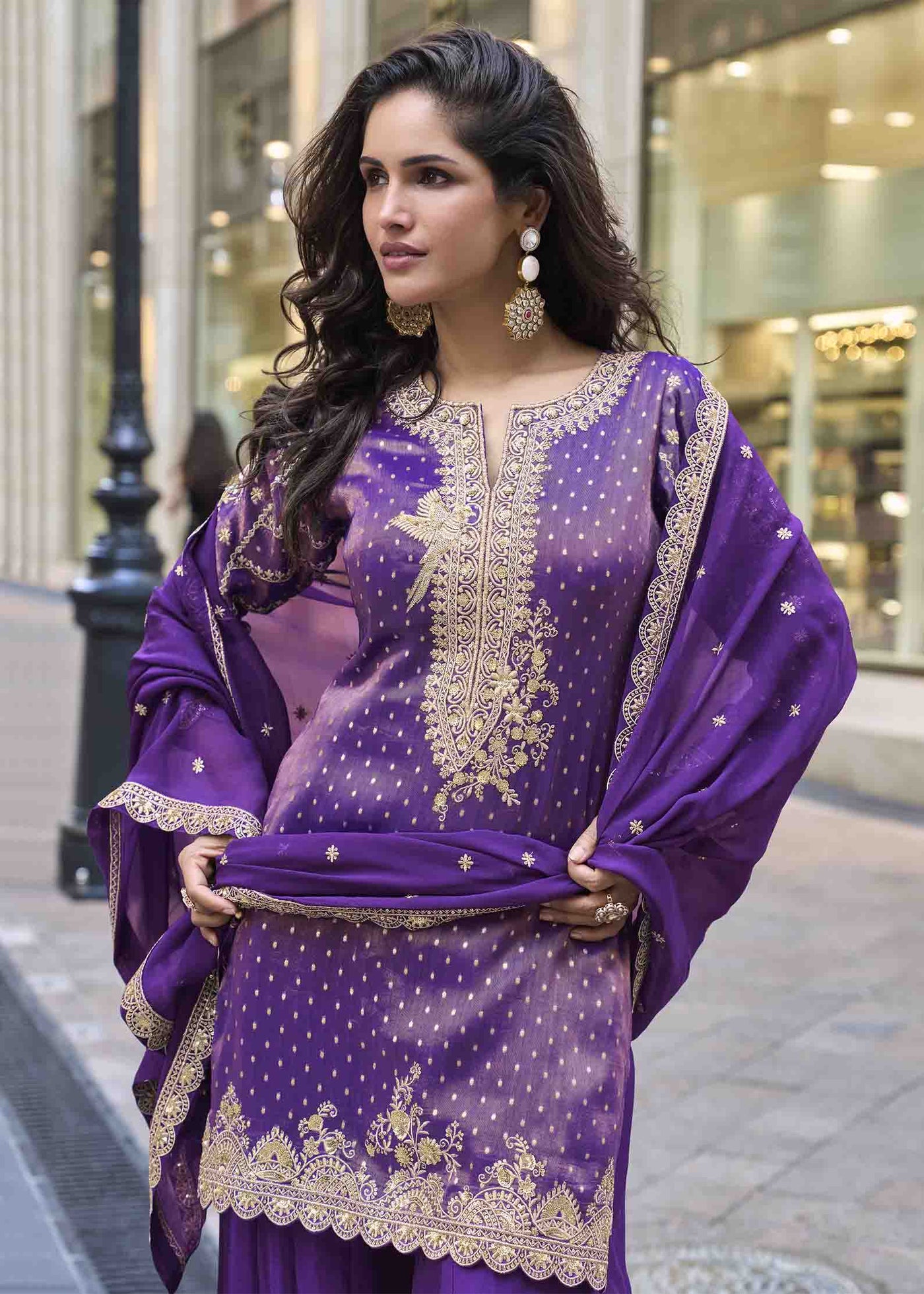Purple Viscose Silk Embroidered Sharara Suit Sale