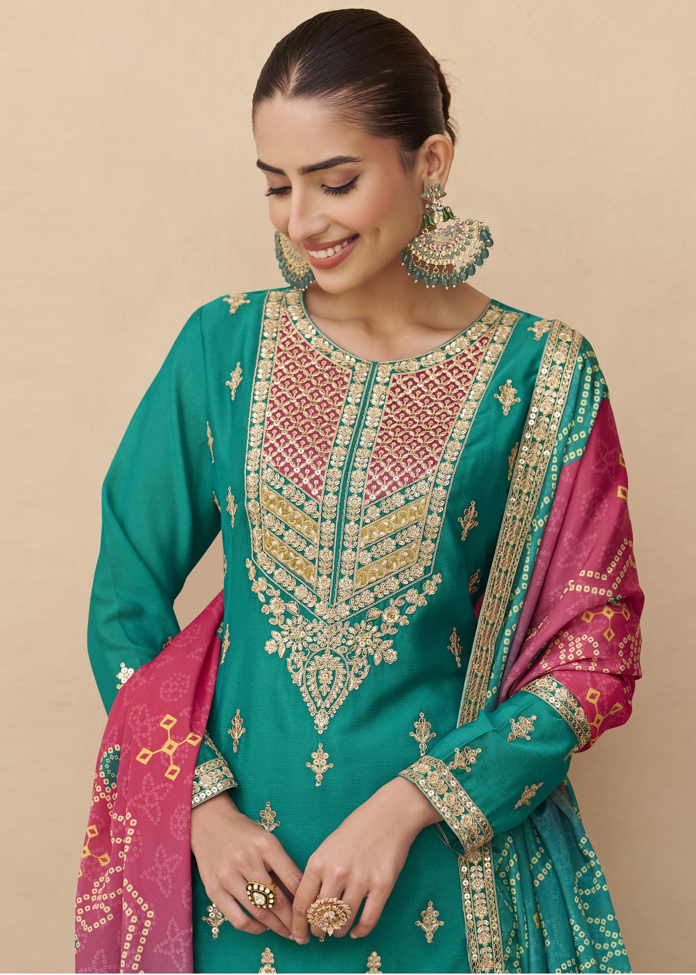 Green Chinon Silk Embroidered Gharara Suit – a vibrant, elegant, and timeless ensemble designed for women who prefer understated luxury with rich craftsmanship. The rich green shade pairs beautifully with premium chinon silk, creating a fluid, graceful silhouette that radiates festive charm and sophistication. The free-size stitched top and gharara offer effortless drape and comfort, while the coordinating dupatta features a premium digital print that adds a refined finishing touch to complete the look.