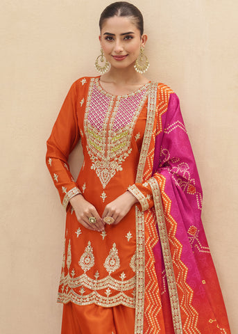 Orange Chinon Silk Embroidered Gharara Suit – a striking, elegant, and timeless ensemble designed for women who prefer understated luxury with rich craftsmanship. The vivid orange shade pairs beautifully with premium chinon silk, creating a fluid, radiant silhouette that delivers sharp festive presence. The free-size stitched top and gharara offer effortless drape and comfort, while the coordinating dupatta features a premium digital print that adds a refined finishing touch to complete the look.