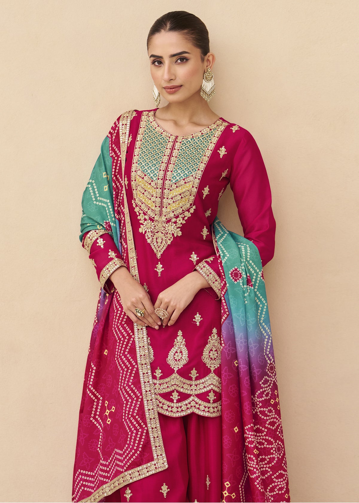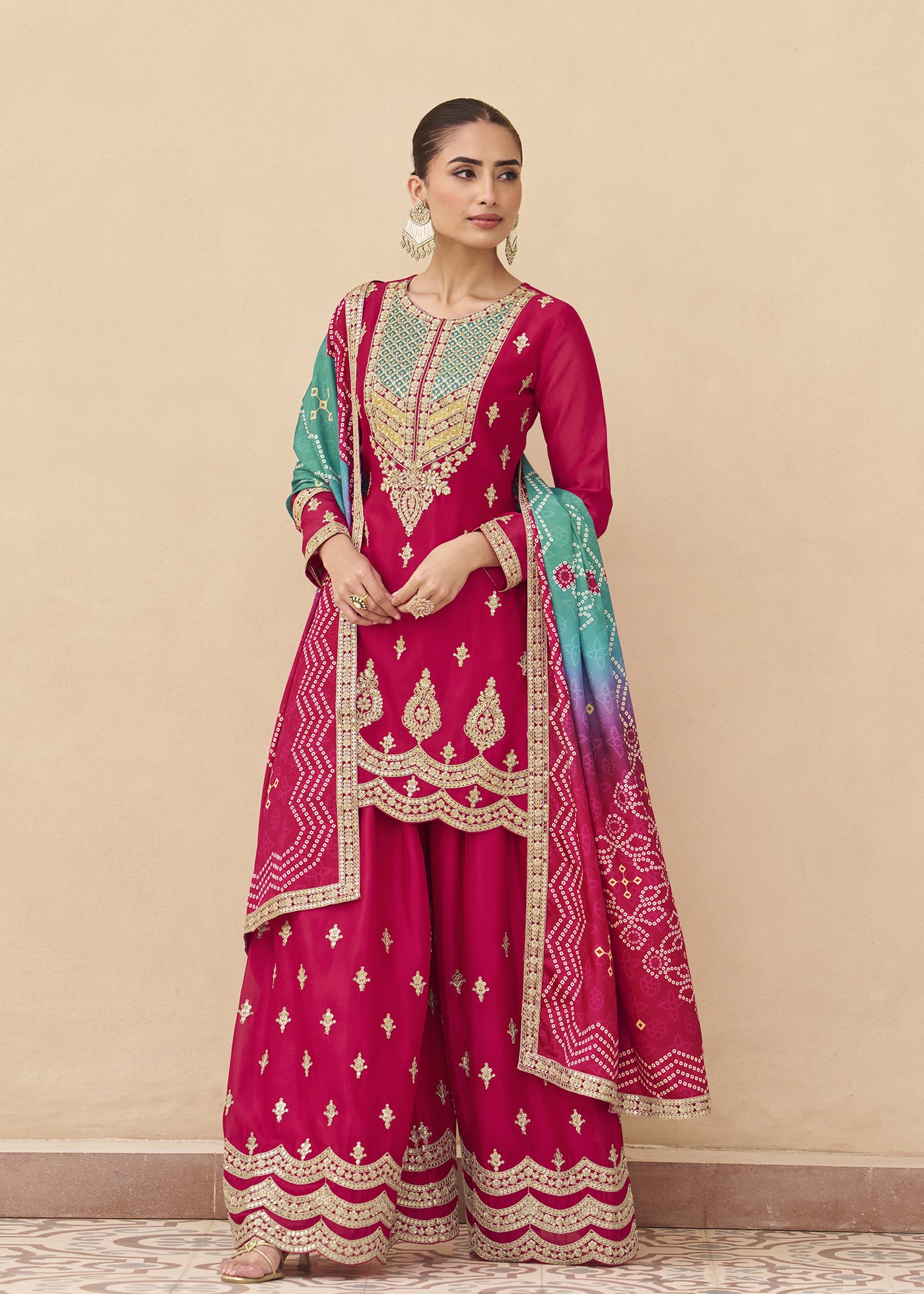 Red Chinon Silk Embroidered Gharara Suit Sale