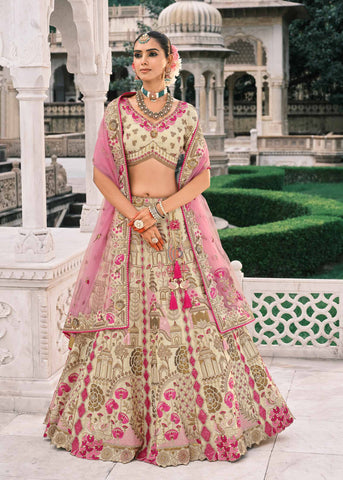 Cream Embroidered Silk Bridal Lehenga – made for the bride who wishes to turn her special day into a story of elegance and charm, this enchanting masterpiece reflects pure sophistication. Crafted from premium silk fabric and paired with a delicate net dupatta, this lehenga radiates timeless beauty and royal poise. The serene cream hue symbolizes purity and grace, while the exquisite embroidery and delicate mirror work add a touch of regal brilliance. Perfect for brides who prefer understated luxury with an aura of classic refinement.