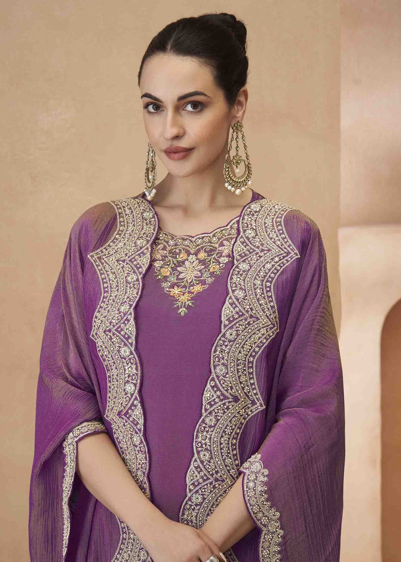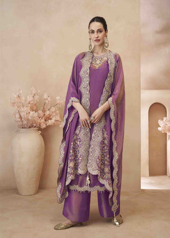 Purple Simar Silk Embroidered Palazzo Suit – a statement of elegance and royal sophistication, designed for women who adore timeless festive fashion. The rich purple hue exudes grace and luxury, while the premium Simar silk fabric drapes beautifully with a refined sheen. Featuring intricate embroidery across the top and a jacket-style dupatta, this ensemble effortlessly blends classic charm with modern flair, perfect for grand celebrations and festive gatherings.